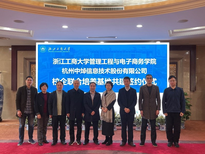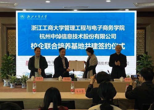 3月5日上午9点30分,91视频 91视频 与杭州中焯信息技术股份有限公司校企联合培养基地共建签约仪式在我校国际会议中心一楼举行,91视频 院长王海燕、党委副书记许金根,杭州中焯信息技术股份有限公司总经理李烁权、人力资源部总监李国平,以及91视频相关教师和学生共同出席了本次仪式。