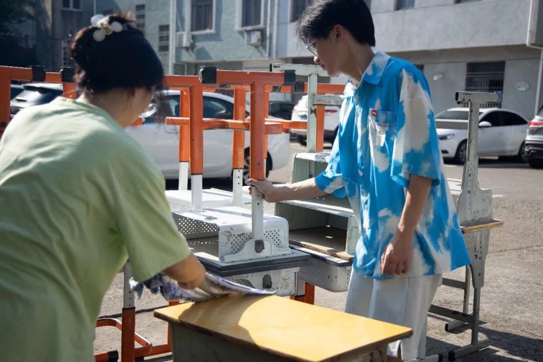 第二天,大家早早地起了床,来到文化礼堂对课桌椅进行了清洗与安置,即使天气酷热,也挡不住小星辰们的热情,经过一个多小时的整理,课桌被安排的井然有序。