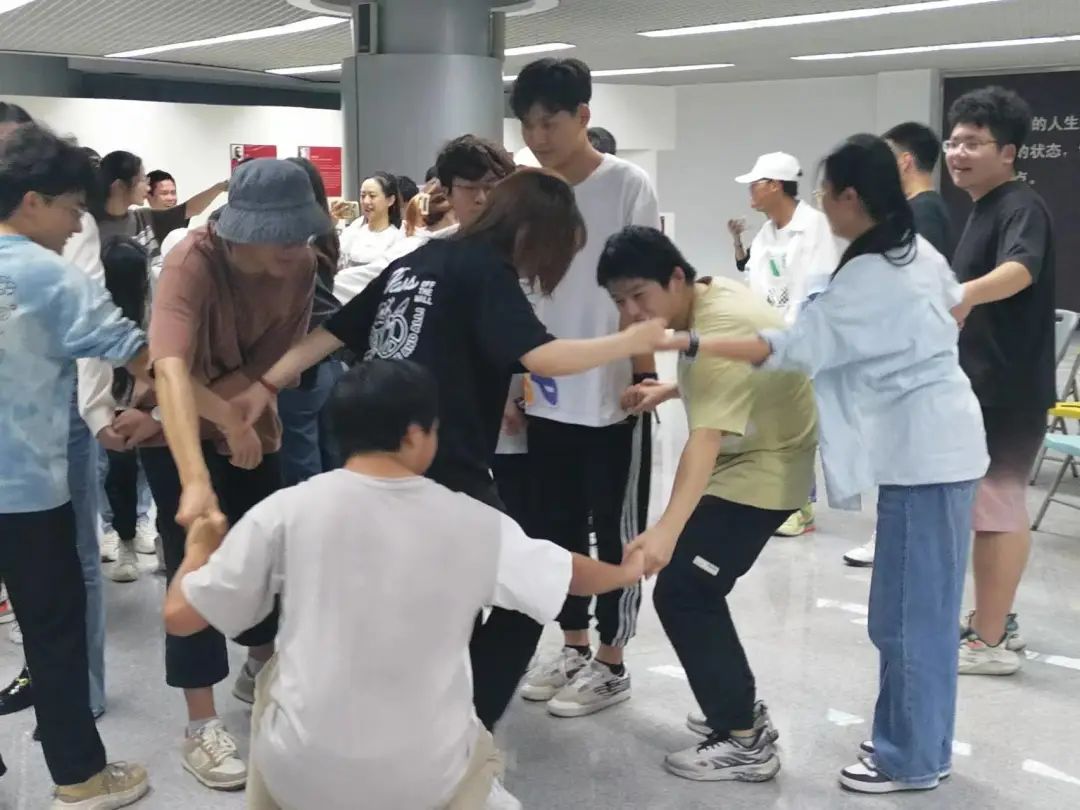 手拉手连成圈,音乐响起自由走动,音乐停止保持静止,并在人群中保持相对位置,牵起最初左右手牵着的人。最初的那个普通圆圈,因为走动连成了一个一个结。我们不放手,通过集体的智慧,慢慢解开所有的结。