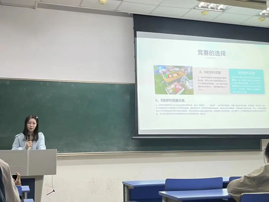 学姐从竞赛、“三创赛”这两个方面向大家做了一些简单的介绍。她建议大家可以从校创开始,对竞赛流程有个初步的了解,并建议我们可以从咨询任课老师、查看相关公示、咨询学长学姐等途径来寻找一些竞赛项目。