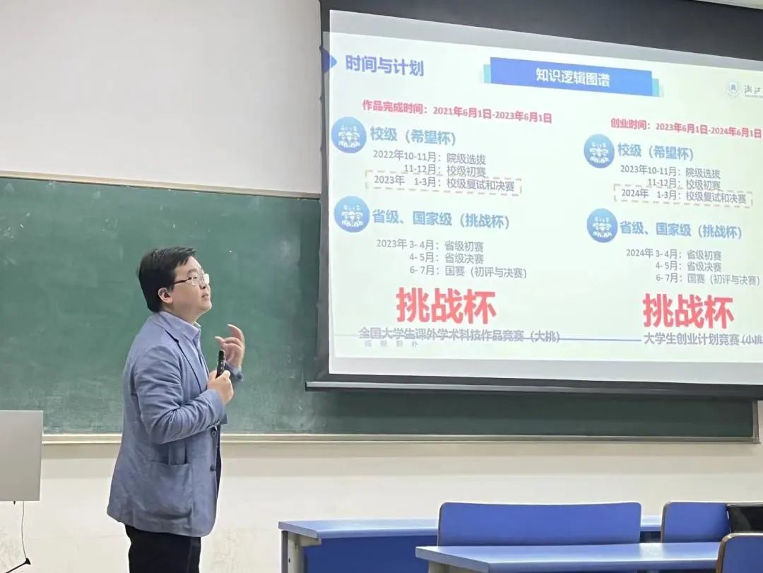 老师分享了一些关于挑战杯等科技竞赛的经验,提到挑战杯在校内叫做希望杯,分为“大挑”(全国大学生课外学术科技作品竞赛)和“小挑”(大学生创业计划竞赛),分别隔年举办,在每年的10-11月进行院级选拔,11-12月进行校级初赛,次年1-3月进行校级复赛和决赛。