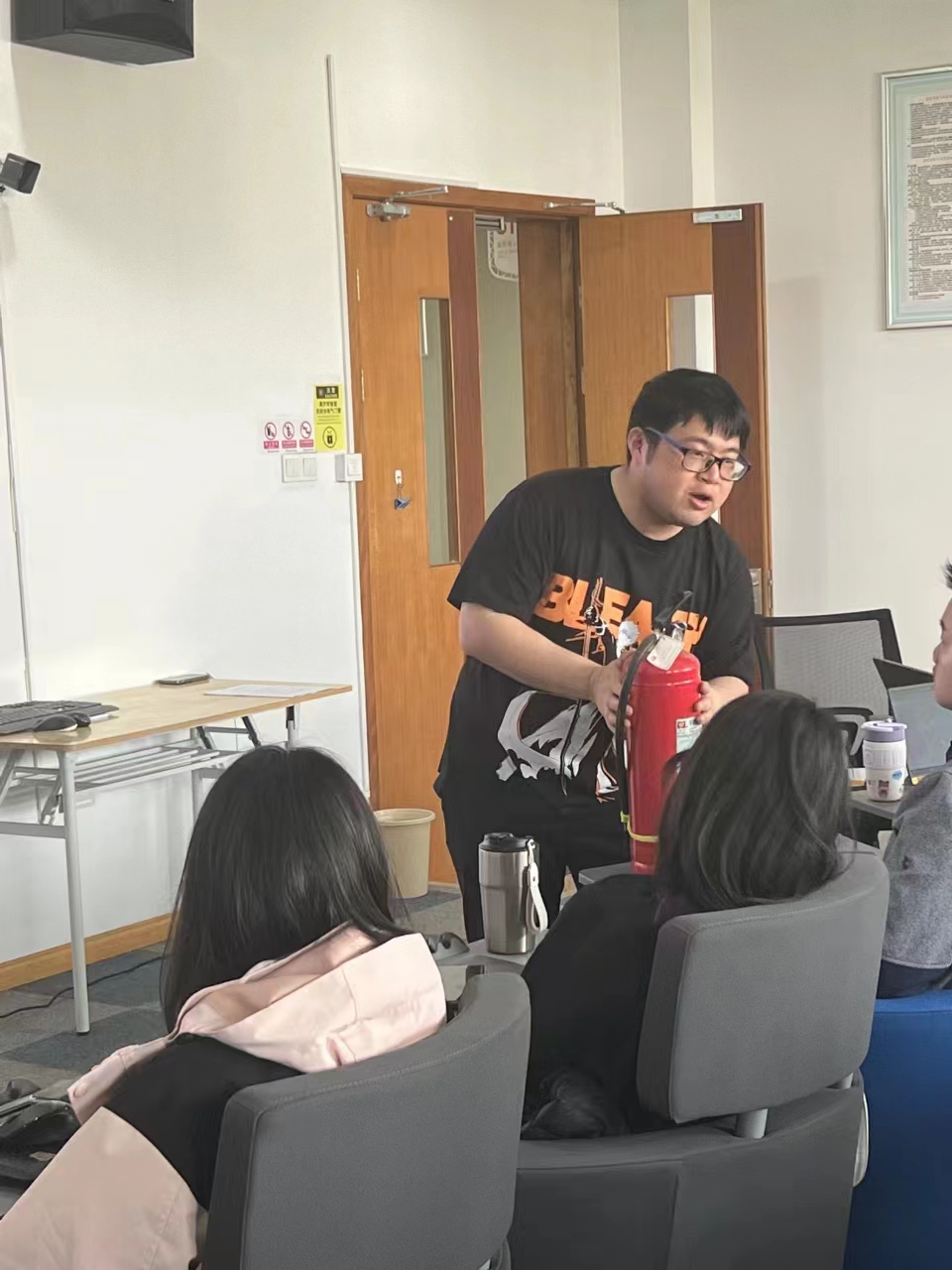 培训过程中,高老师不仅对实验室消防安全知识、用电安全防范措施进行了详细的讲解,还示范了消防用具的正确用法,同时指导各培训人员在今后的消防工作中正确使用灭火器、灭火毯等消防工具。另外,高老师着重强调了实验室准入的行为准则,提出离开时要做好安全检查工作,并时刻注意防范,保证安全,做到“预防为主,安全第一”,共同营造一个安全、稳定、和谐的实验室环境。与留学生的互动交流环节,促进了实验室管理人员与留学生之间的经验交流,共同探讨实验室安全问题,寻求解决方案。